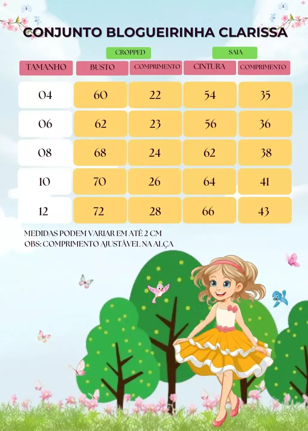 Acreditamos que cada criança é única, assim como seu tamanho e estilo. Por isso, o Conjunto Boho Azul Bebê está disponível em diferentes tamanhos, desde o 4 até o 12. Garanta um ajuste perfeito e permita que sua pequena aproveite o visual encantador do boho em todos os momentos.