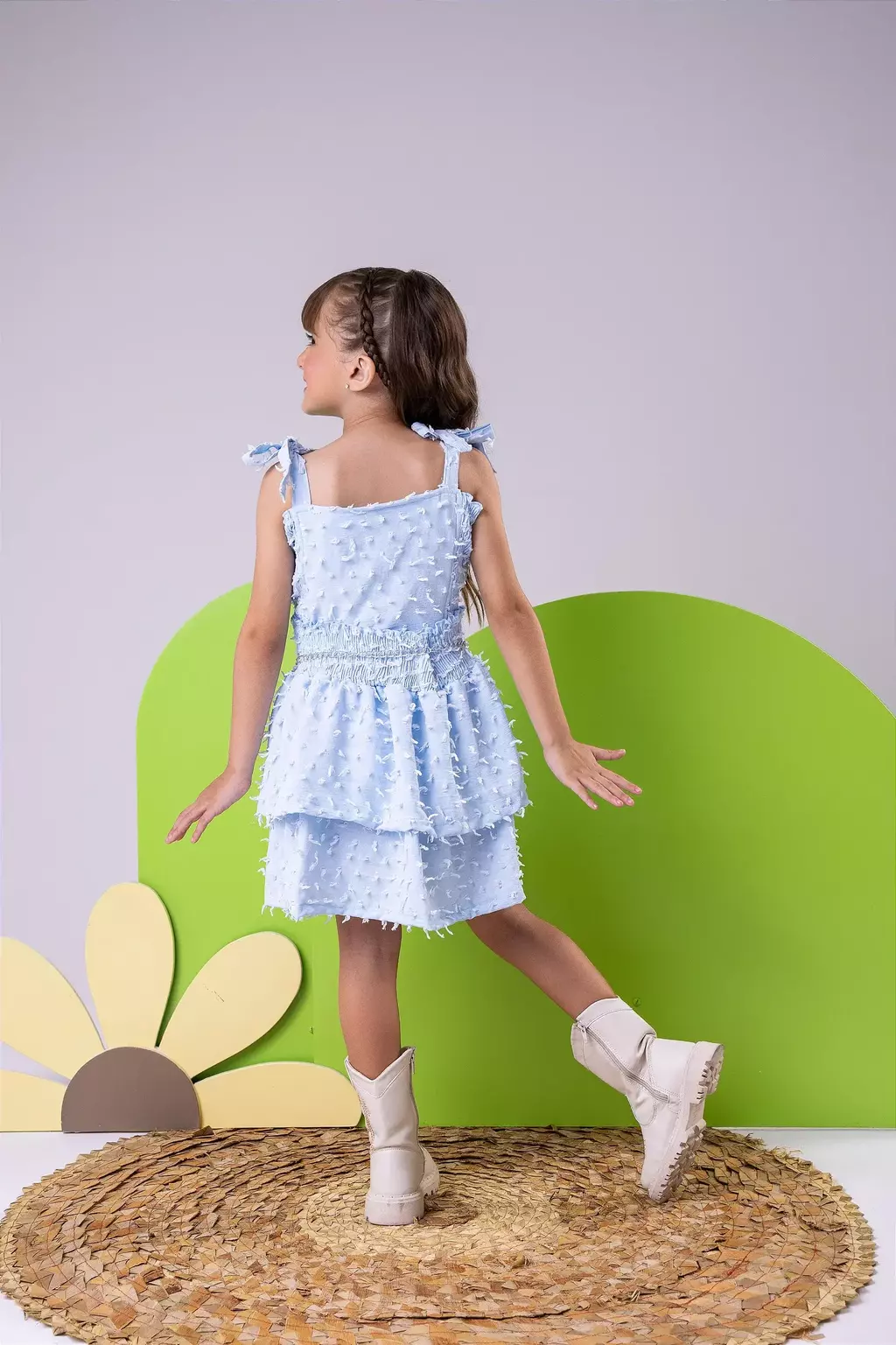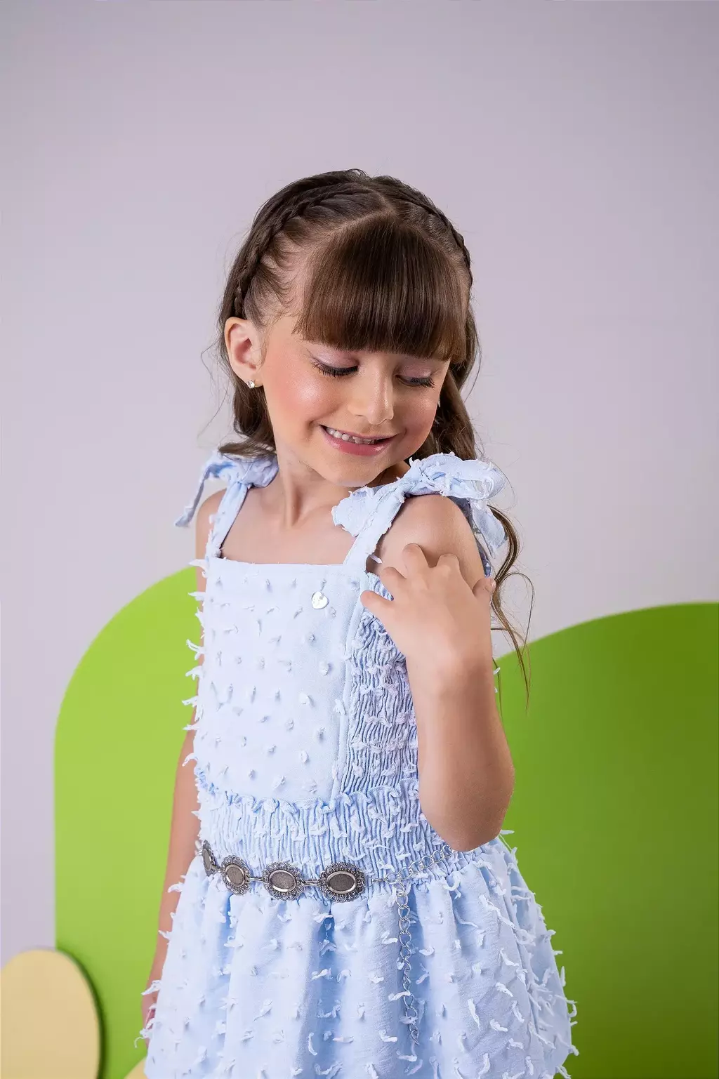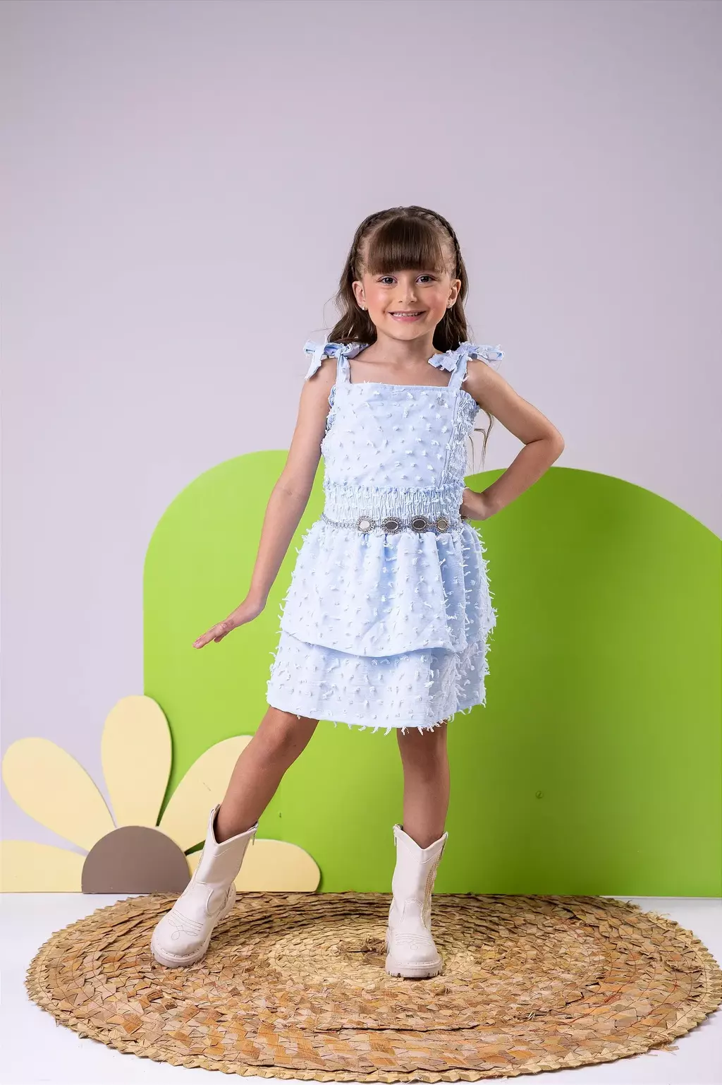 A cor Spindle traz um tom suave e versátil ao Conjunto Boho Azul Bebê, permitindo combinações incríveis e cheias de estilo. Seja para um passeio no parque ou uma festa especial, sua pequena estará sempre bem-vestida e pronta para arrasar com essa peça única.